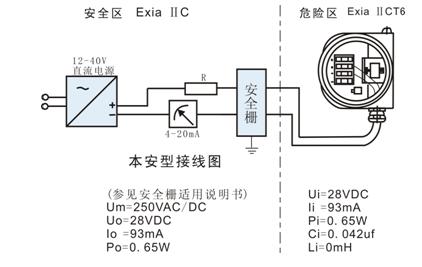 ● 本安參數(shù):Ui:28VDC,Ii:93mA,Pi:0.65W,Ci:0.042uf, Li:0mH
